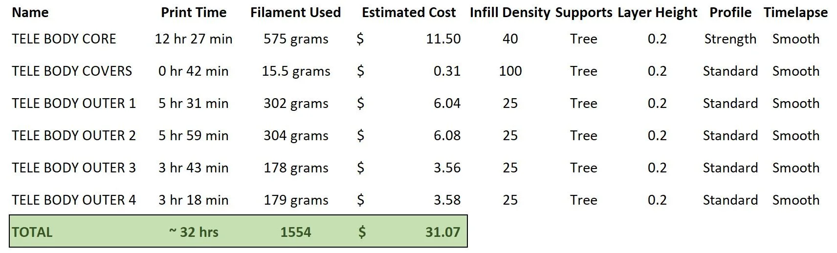Since the outer pieces do not see any significant load, I printed them using the “Standard” profile with 25% infill and the default 2 perimeter wall loops. That being said, you can can increase any of the infill percentages if you are looking for a stronger or heavier guitar body.