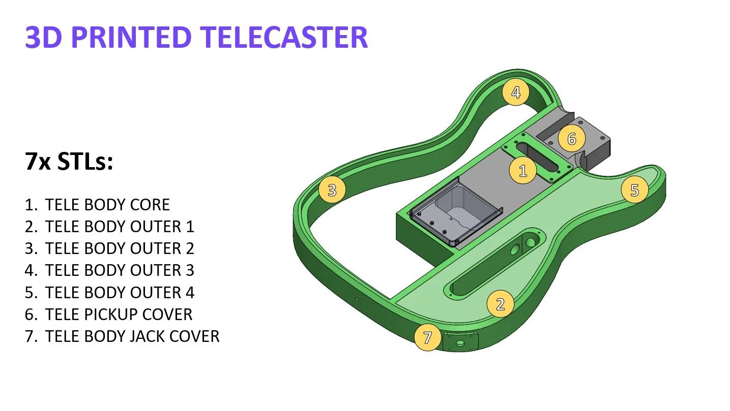The guitar body is designed to go together using wooden dowel pins that are 10mm in diameter and 50mm long. That being said, you could also use 3D printed dowels if you prefer. The dowel pins are used to align the parts during assembly and they also provide some stiffness to the body.